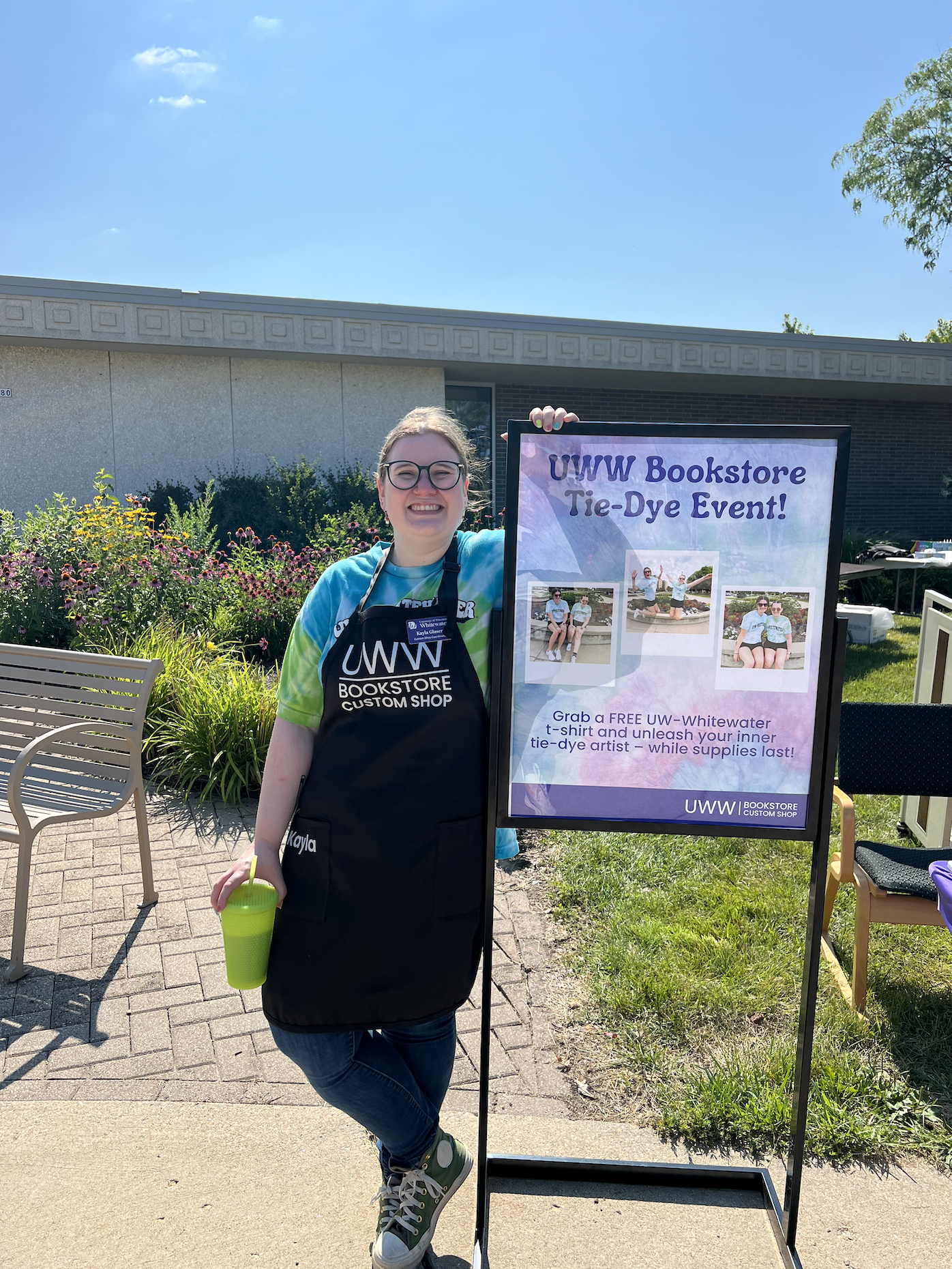 On my very first day working as the Custom Shop manager, I wrote in my notes that I wanted to host a tie-dye workshop someday. In Fall of 2024, after we’d now nailed the formula for a successful event, this was finally a reality. For the shirt design, I decided to use the same “UW-Whitewater” arched graphic that had worked previously. I prepared all the tees, including soaking them in a soda ash solution that would make the colors develop. Then, a few weeks before the event, I made practice shirts with three student workers so we had photos for social media.
