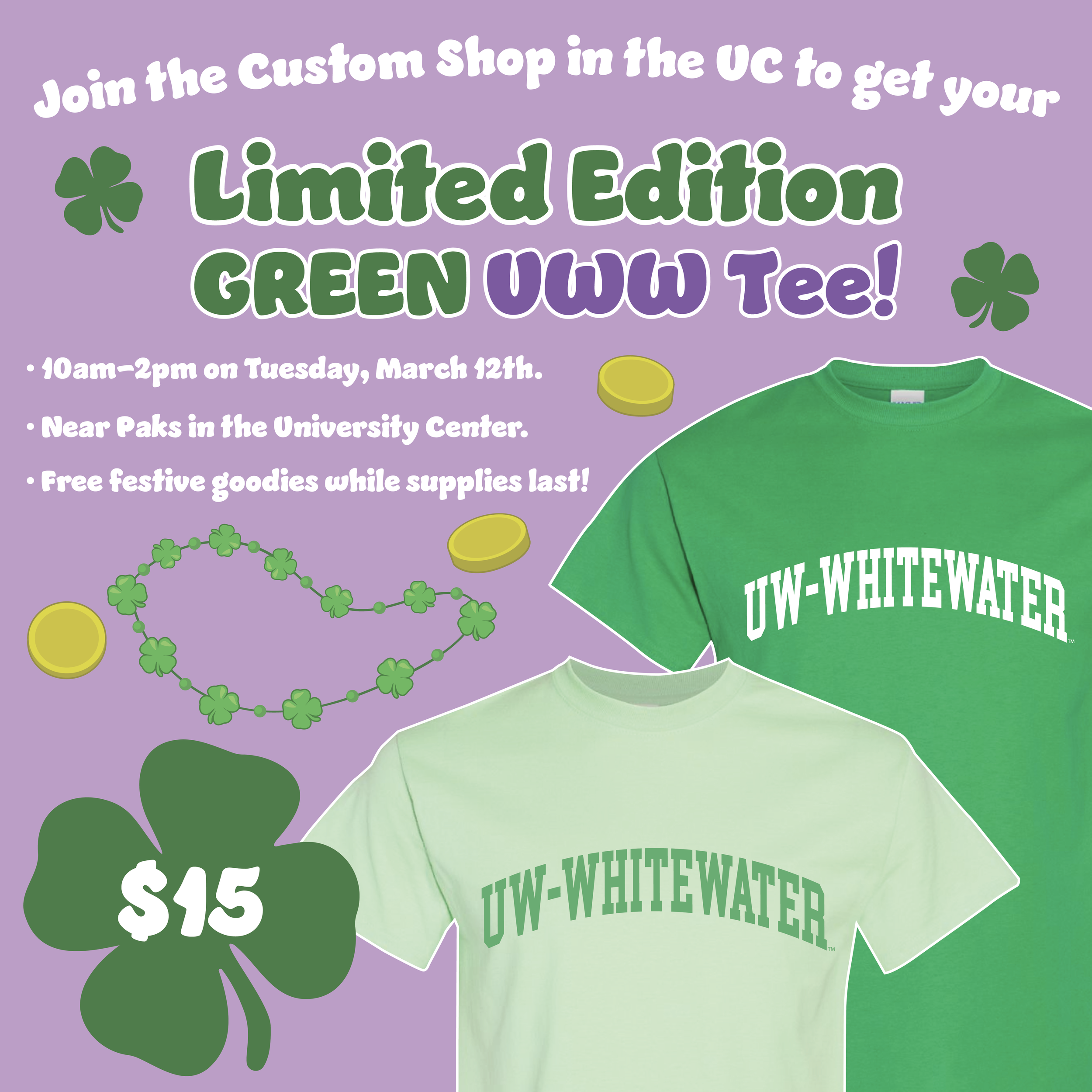 Quickly following the feedback from Valentine’s Day, we decided to try a similar model for St. Patrick’s Day. Rather than a loud, cartoony design, I used classic collegiate arched text. I couldn’t find a typeface that I liked for this, so I customized it myself by moving anchor points around. We also decided that instead of doing a giveaway, we were going to attempt a popup sale in the University Center. We sold around 70 tees: our most successful event yet!