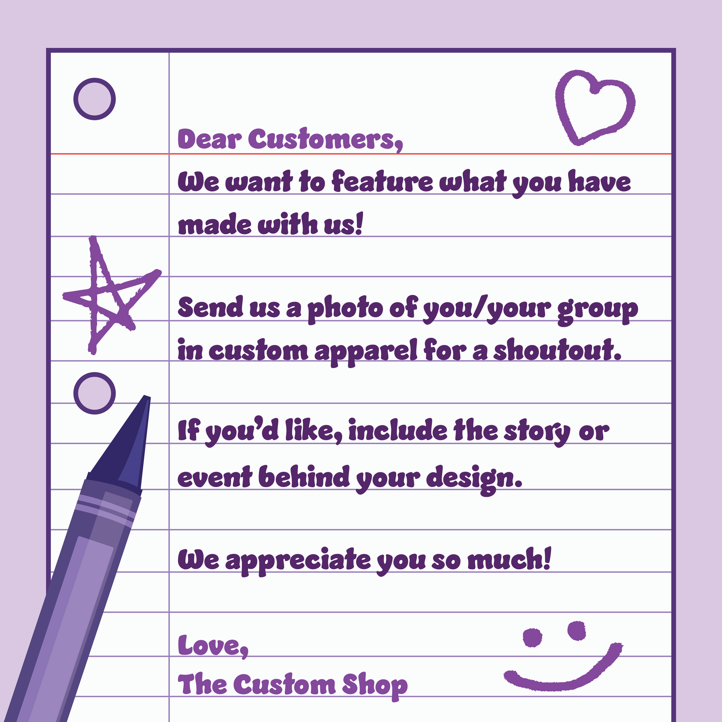 The Custom Shop’s branding was meant to match the rest of the Bookstore, with shades of purple and a comforting, supportive aura, but leaning a bit sillier at times. To play off of my department’s creative capabilities, I liked to make posts where shirts were illustrated in unexpected places, for example flying on a kite string or being worn by an animal.